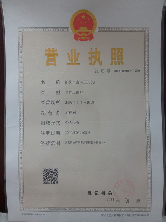 证书介绍 泊头市鑫丰压瓦机厂专业为客户开发设计制造各种冷弯成型设备及辅助配套设备
